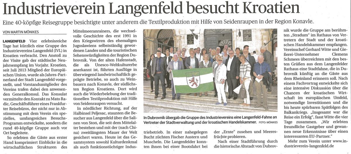 Langenfeld. Vier erlebnisreiche Tage verbrachte Mitte April eine Gruppe des Industrievereins in Kroatien. Den Anstoß zu dieser Visite gab der städtische Neujahrsempfang im Vorjahr. Das EU-Mitglied (seit Juli 2013) wurde als Jahres-Partnerland vorgestellt, und Verantwortliche des Industrievereins trafen dabei den anwesenden Generalkonsul.